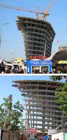 This apartment building ended up under the bridge - imagine the living conditions there, noise, vibration, etc...